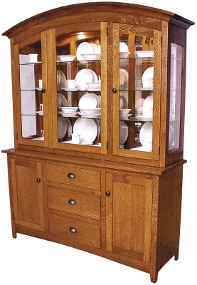 Elegant simplicity is embodied in our Adobe Mission China Hutch. Available in two 3-door sizes, this china cabinet fits the Mission stereotype in all the right ways. Strong, straight feet, a minimal lower apron, flush doors with inset panels, and smooth sides all speak to Spanish Mission-inspired decor. Amish craftsmanship shines with dovetailed drawers that open on full-extension slides for easy access. A solid inch of your chosen hardwood tops the buffet base with a hand-sanded, buttery smooth finish.Your Adobe Mission China Hutch takes on a few modern design details. Flush doors include light guards so that your touch-controlled recessed lighting is properly focused within. Beveled glass adds a dramatic touch while allowing all your wares stowed on the plate-grooved, adjustable glass shelves to be easily admired. A mirrored back reflects your china or collectibles for a refined presentation. To order as shown, choose Burnished Honey over Quartersawn White Oak. Take your time to determine the hardwood and stain you prefer. Your Adobe Mission China Hutch will then be built to order and delivered to your door.