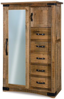 Flat panel sides, adjustable wooden shelves, and industrial metal hardware create the rustic Aldrich Sliding Door Chifferobe. Perfect for adding extra storage space to any bedroom, your 5-drawer cabinet is crafted to endure with solid American hardwood construction. Hand-stained to your liking, the Aldrich Sliding Door Chifferobe is offered in 11 domestic hardwoods including a charming Rough Sawn Maple. Keep the classic look as shown, or design your own one-of-a-kind heirloom.Complete your Amish-made Aldricj Bedroom Collection with the addition of a hardwood bed, mirror dresser, blanket chest, and nightstands, Each made-to-order piece is crafted in the heart of Amish country before begin delivered to your home.