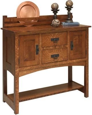 Pictured in Quartersawn White Oak with Burnished Honey stain, your Alicia Sideboard with Plate Rack is Southwest inspired and works well in your Mission or Craftsman dining area. Have yours made in Brown Maple, however, and with a painted finish and different hardware, this simple server can be customized to work in Shaker, Transitional, or Modern motifs as well.Whatever you choose, thank you for choosing Countryside for your authentic Amish furniture. Each drawer in this buffet features a durable dovetailed joint and opens fully. Each cabinet in this server opens to reveal an adjustable shelf. An open-air shelf below completes your custom storage space. Add the Alicia Sideboard with Plate Rack to your online shopping cart today.
