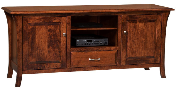 Create a well-organized and styled entertainment room with our Alix Media Console, showcased in gorgeous domestic Cherry hardwood. This grand storage piece offers a large 72" wide television platform, an open component shelf, and a handy drawer and cabinets underneath. An adjustable hardwood shelf resides behind each inset paneled door.Choose the hand-finished stain or paint option perfect for your home. Request finish samples at checkout to make sure we get your Alix Media Console just right. Each console will be handcrafted in the heart of Amish country and delivered fully assembled to your living room.