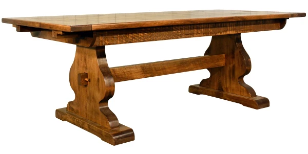 Make a statement in your dining room with this impressive dining table in our popular Rough Sawn Maple hardwood. It is statuesque, available in 24 sizes, but the warm tones make it an inviting feature piece for family meals, too. The Belledonne Trestle Table's striking carved pedestals are a lovely design detail, complementing the 1 1/2" thick top and through tenon beam. Through-wedged mortise and tenon joints, crafted by our expert Amish craftsmen, provide strength and visual interest.Each end of the table extends to accept a 12" leaf, making it simple to use and subtle, and its high quality construction means it will work well for years to come in your home. You can rest assured that your Belledonne Trestle Table will stand the test of time. Do you prefer the dining table as pictured? Consider our hand-applied Weathered Map stain,
