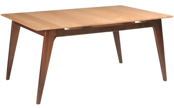 Bring the beauty of Amish craftsmanship, shapely solid wood legs, and mid-century design to the dining room with this expandable dining table. Our Cortez Leg Table, equipped with a 1" thick table top, is offered in numerous sizes to accommodate city living and formal dining rooms alike. Stylish raked legs are solidly attached to a 3 1/2" wide skirting. Depending on which starting size you select, your Cortez Leg Table may self-store its 12" center leaf extensions.You will love the simplicity of this stylish table. Its rich wood finish contrasts with a Maple table top and dark Walnut base. Keep this look as shown, or create a one-of-a-kind Cortez Leg Table for your home or business.