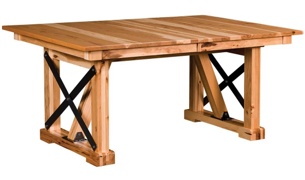 With a square corner top and metal trestle accents, the Cullman Industrial Trestle Table is a practical and gorgeous accent for the kitchen or dining room. The aesthetic is clean and architectural, while the authentic Amish craftsmanship is solid and time-tested. Order a Cullman Industrial Trestle Table in one of four sizes and indicate your expansion preferences for up to four leaves. The hardwood trestle table will open effortlessly on geared slides.The Cullman Industrial Trestle Table is showcased in Natural Hickory for a decidedly rustic feel, but your made-to-order trestle table will be built to your specifications. Indicate your carefully crafted design selections by completing the online options menu, or request real wood samples to aid in your decision.