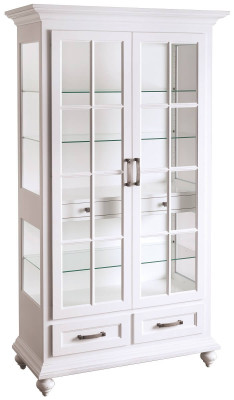 Anchor your farmhouse or French Country interior design with a handmade statement piece from Countryside Amish Furniture. As a focal point in any dining area or family room, this Dale Curio is a stunner. Interior lighting, adjustable glass shelves, and interior plus bottom drawers offer a variety of storage options.Stunningly simple in a White painted finish over smooth Brown Maple hardwood, your Dale Curio will be built and finished based on your design specifications. Complete the online options menu and request real wood samples to view at home; Countryside Amish Furniture will handle the rest.