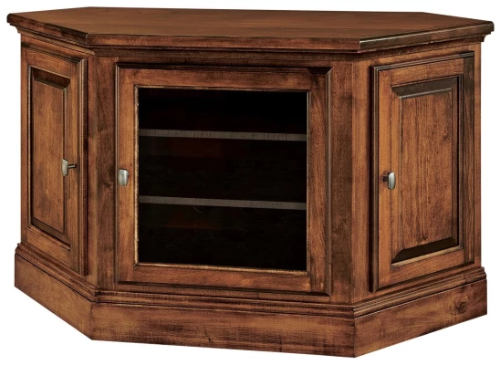A great addition to any style of living room, basement, or bedroom, the Edmore 3-Door Corner Console was beautifully designed by Amish artisans in the USA. This corner TV console features two hardwood doors with a fixed shelf behind it for your media collections and accessories. A glass door is positioned on soft-closing, concealed hinges and conceals two adjustable shelves ideal for your television components.Our experienced Amish craftsmen, take the time and care necessary to construct only the best for you and your family. Choose your favorite wood species and stain color to make the perfect media cabinet for your home. As shown, the Edmore 3-Door Corner Console showcases a Southern Pecan wood finish over Brown Maple.
