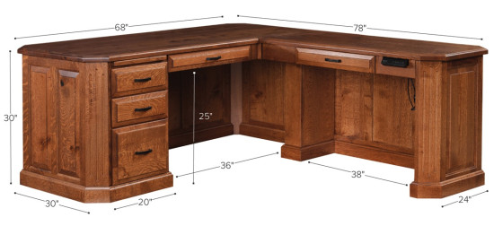 Handcrafted by skilled Amish artisans, this solid Glocester Corner Lift Desk showcases traditional craftsmanship with modern performance. A raised panel back presents a polished client view, while the 1¼" thick top with clipped corners highlights the natural character and grain of the wood. Pictured in Rustic Quartersawn White Oak, the desk’s warm texture and subtle figuring enhance its heirloom-quality presence. Design a one of a kind luxury office with Countryside Amish Furniture.