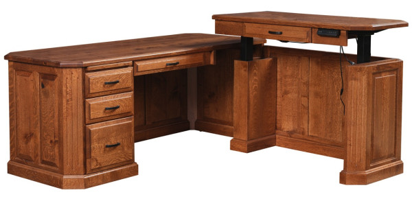 Designed for both productivity and comfort, the Glocester’s return section features an integrated lift top that smoothly adjusts up to 50 inches high, allowing seamless transitions between sitting and standing. Every detail has been thoughtfully considered, from dovetailed storage drawers and a pencil drawer to soft-close, full-extension slides that ensure effortless motion. The layout provides generous workspace, organized storage, and the flexibility to configure the return on either the left or right to suit your office.Handcrafted by skilled Amish artisans, this solid Glocester Corner Lift Desk showcases traditional craftsmanship with modern performance. A raised panel back presents a polished client view, while the 1¼" thick top with clipped corners highlights the natural character and grain of the wood. Pictured in Rustic Quartersawn White Oak, the desk’s warm texture and subtle figuring enhance its heirloom-quality presence. Design a one of a kind luxury office with Countryside Amish Furniture.