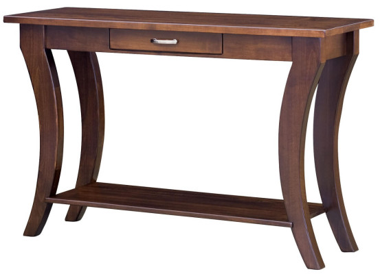 A charming addition to your entryway or den, this eye-catching Hamden Sofa Table showcases a dovetailed drawer and open display shelf. Elegantly curved legs and a smooth wood finish create a refined piece of timeless furniture, while solid hardwood construction creates a functional heirloom. Each Hamden occasional table is handmade by expert Amish artisans.Create your one-of-a-kind Hamden Sofa Table by making your wood, hardware, and stain selections. If you prefer the open console as pictured, select Brown Maple hand-finished in our Winter Bark stain.