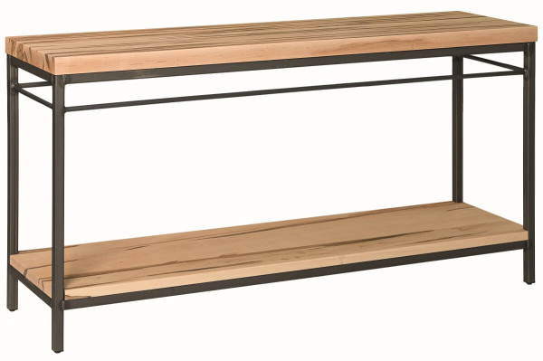 Mix up your decor with metal when you purchase the Harleigh Sofa Table. This Amish-crafted piece blends a genuine solid wood top, carved from the most sturdy and pure of American hardwood, with a beautifully welded steel base. This two-tier treasure, accented with interesting steel cutouts in the base, offers two slabs of ample space to display all of your prized possessions.To mirror the pictured image of the Harleigh Sofa Table, choose Rustic Brown Maple with an Au Naturel wood finish. The long, Amish-built console is custom-made to fit your needs and is available in seven different wood types, countless finish options, and powder coat colors.