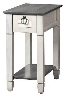 The compact yet stylish design of this handcrafted side table brings both function and charm to your living space. The single dovetailed drawer, equipped with a decorative ring pull, provides durable and smooth operation, making it a practical spot to store essentials like remote controls, coasters, or small accessories. Available in two convenient sizes, 13 inches wide and 22 inches wide, this side table ensures a perfect fit for spaces both large and small. The narrower option is ideal for cozy corners or as a chairside table, while the wider option offers extra surface area for a lamp or decor. Both sizes include a sturdy lower shelf, adding versatility for displaying books, plants, or baskets while maintaining an open and airy feel.The Kinsale Chairside Table's clean lines and contrasting finishes—featuring an optional weathered white base paired with a gray-stained top—create a modern farmhouse aesthetic that complements a variety of interior styles.