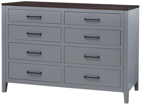 Our Kuna 8-Drawer Dresser provides clothing storage for your master bedroom or modern guest retreat. Our clean-lined, beautifully-detailed Kuna bedroom storage makes a show of solid wood's unique charm. This handsome double dresser provides eight roomy drawers attached to side-mounted slides. Premium hardware allows each box to open to effortless full extension and close softly. Made to order by expert Amish craftsmen, the Kuna 8-Drawer Dresser boasts solid hardwood construction coupled with mortise and tenon joinery.To obtain the look shown, select Brown Maple with a two-tone finish. The dresser top is stained in Venezuelan Chocolate while the base showcases a painted Shaker Grey finish. For inspiration, view our collection of premium stains and finishes and request real wood samples to view at home.