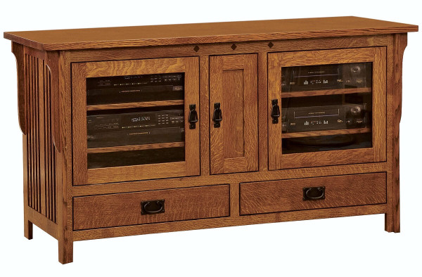 Influenced by the mission style, the Lakeland 3-Door TV Cabinet features gorgeous corbels, diamond accents, and slatted sides. Keep your media collections organized within two dovetailed, soft close drawers and cabinets with adjustable hardwood shelving. The 60-inch TV stand boasts solid hardwood construction coupled with time-tested mortise and tenon joinery for longevity.Countryside Amish Furniture's Lakeland 3-Door TV Cabinet may be customized to your specific request in your preferred hardwood, stain or paint, and metal hardware. Keep the classic Arts and Crafts appeal alive by selecting Quartersawn White Oak and a Burnished Honey stain as shown pictured here.