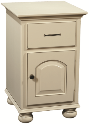 Combining essential bedroom storage with cottage charm, the Madeline Nightstand is the perfect addition to a master bedroom or guest retreat. The arched raised panel door and single drawer encase your personal belongings. Crafted one at a time by expert Amish artisans, the furniture comes to your home with quality workmanship featuring a full-extension drawer, easy-open door, sturdy sides, and 1-inch solid wood top. Each piece of the Madeline bedroom furniture comes with its signature bun feet.Complete your bedroom set with one or two of these lovely pieces of handmade furniture. To get this same look in your home, let us build your Madeline Nightstand in Brown Maple with a specialty painted finish.
