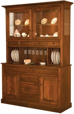 A simple molding base is sturdy and stylish as your Milton Chase China Hutch makes its understated presence known in your dining room. Flush door and drawer fronts as well as smooth sides create a clean line while the raised panel doors offer a subtle contrast. Five large drawers in the sideboard base of your hutch offer sufficient storage for linens and flatware. An inch-thick top of solid hardwood caps off your buffet server base. Open deck storage for stemware and plates rests below four smaller drawers in your china hutch. Above, mortise and tenon doors encompass beveled glass to create a display cabinet complete with plate-grooved, glass shelves and touch-controlled recessed lighting. Eighty-six inches later you arrive at the minimal crown and finished top of your Milton Chase China Hutch.To order as pictured, choose Brown Maple with Burnished Honey. If you prefer a more dramatic look, take your stain darker. Consider which form your Milton Chase China Hutch should take in your home and make your style selections. Our Amish artisans will craft it to order and Countryside will have it delivered to your home or business.