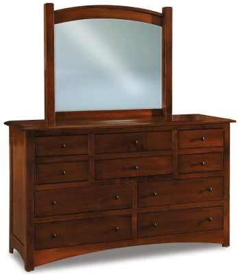Ten dovetailed drawers on full extension slides are housed within the arched base and one-inch solid wood top of the Norway Large Mirror Dresser. Dovetailed joinery provides lifelong durability for your drawers, while full-extension slides allow ease of access to the entire drawer space.Pictured in Brown Maple with our Mulberry Velours stain, This piece is sure to be the focal point of your bedroom in any wood and finish combination you desire. If you would like to have your dresser without a mirror, you can select to remove it from the options below. Customize your wood, finish, and hardware to create a dresser that is uniquely yours.