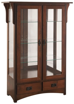 At Countryside, all our furniture begins with the hardwood species of your choice. Only premium domestic woods are used by our Amish artisans to create heirloom quality pieces you will be proud to hand down. Our Ravenna 2-Drawer Curio is only one such example. The 2-door display cabinet features three adjustable glass shelves along with a mirror back and touch lighting display.Perfect for china or collections, this exquisite curio is mission in style, but very adaptable. As pictured in Brown Maple with a Cherry Mocha finish, this piece is elegantly refined. Make your selections in the menu provided and our furniture-building experts will craft it to order.