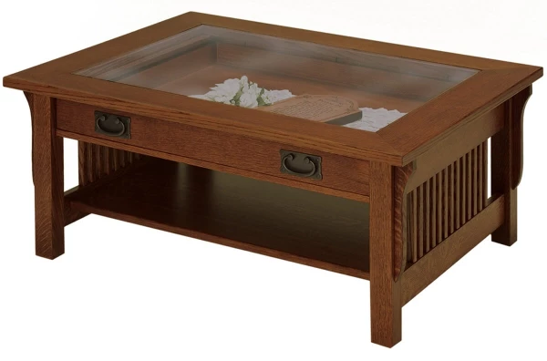 Our Amish woodworkers will hand-make your solid wood coffee table, with a full inch-thick top that will be inset with beveled glass for a display area. For safety precautions, the glass will be tempered making it stronger than standard glass, so should it break, it does so in pebbles, and not with sharp edges. Peer into the built-in display, which will be encased below the glass top, to appreciate the collection of precious family heirlooms. Because of the quality of the handmade furniture, this occasional table could also be an heirloom for the next generation.Order a Rushmore Glass Top Coffee Table as pictured by choosing a Burnished Honey wood finish over Quartersawn White Oak. With the signature slats and square legs, this table will pair nicely with end tables, a console table, and upholstered furniture by the same name.