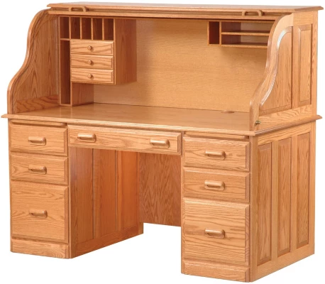 Available in two sizes, this Amish handcrafted roll top desk is made to order. Drawers on full extension slides, pigeon holes, and cubby drawers provide plenty of storage, and the base cabinets store letter-size files. Our Scribe's Roll Top Desk boasts a solid 1" thick writing surface with an additional pullout on each side. Add electric grommets to keep your cords neatly tucked away, and a lap drawer for additional storage.Your Scribe's Roll Top Desk will be built in your choice of solid Oak, Brown Maple, Cherry, Rustic Cherry, Elm, Quartersawn White Oak, or Walnut. After you have selected your wood species, choose from our wide range of finish options.