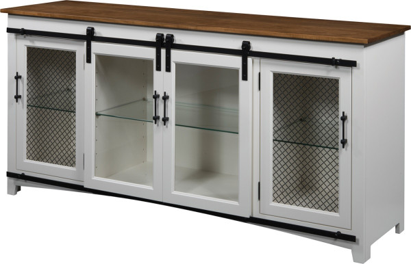 Adorned with its decorative barn door tracks, wire cabinets, and adjustable shelving, the Tensas Display Case is a standout piece that will bring that modern farmhouse feel to your living or dining area. Three adjustable glass shelves are standard with a plate groove, and the buffet boasts touch-controlled LED lighting to illuminate your cherished belongings.Your one-of-a-kind Tensas Display Case is crafted using your preferred American hardwood. A hand-rubbed stain or premium paint and clear catalyzed conversion varnish create a rustic, yet refined piece to be enjoyed for years to come. As pictured, the Tensas Display Case is built in Brown Maple with a two-tone finish. The top is stained in Spiced Apple, while the base cabinet is topped in our White paint.