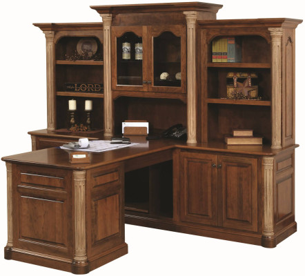 Distinctively classic in style, our Vanderbilt Partner Desk is ornate and regal. A solid, molding base supports grooved corner columns, raised panels, sweeping arched openings in the hutch, and a glorious crown molding above. Every inch of this elaborate piece is handcrafted from the premium American hardwood of your choice. Your solid wood desk and hutch can be stained to match existing furnishings or to contrast against them for a modern feel. The center cabinet boasts touch lighting, an adjustable glass shelf, and glass doors. Whatever you choose, be confident that this monumental executive desk will stand the test of time. With ultra-strong dovetailed drawers that open on full extension slides and mortise and tenon construction throughout, your Vanderbilt Partner Desk will be a legacy.Make your selections and our Amish artisans will prepare your Vanderbilt Partner Desk to your precise specifications.