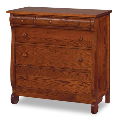 Little hands can easily grasp the wooden knobs of the Victoria Sleigh Children's Chest of Drawers and reveal favorite toys, books, and crayons. For mom and dad, the remaining drawers can be used to organize t-shirts, pajamas, and mismatched socks. Each drawer is mounted on full extension slides allowing you to make the most out of every inch of space.No matter how you decide to use the Victoria Sleigh Children's Chest of Drawers, our Amish artisans will ensure it reflects your specifications. To order the look shown, select Oak with our Sassafras stain.