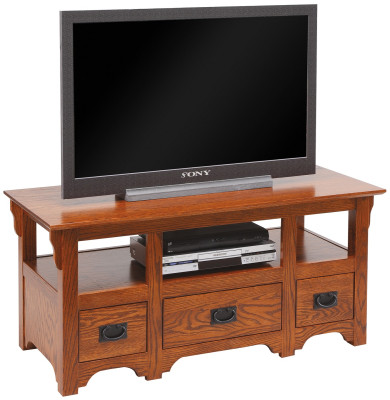 Treat your home to an entertainment upgrade with this console from Countryside Amish Furniture's online collection. Proudly made in the USA from kiln-dried hardwood, this artfully crafted Waynetown TV Stand features an open components shelf. Three spacious dovetailed drawers open to full extension on side-mounted slides. This mission TV stand will be the center of attention in any room.Shown in a popular Oak and our Terra Cotta wood finish, the Waynetown TV Stand will be handmade to your specifications. Request real wood finish samples and determine your design choices in the comfort of your own home.