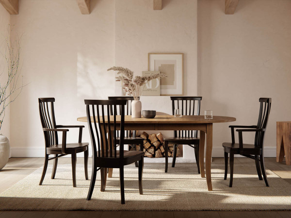 The coordinating chairs bring harmony to the collection with details that highlight artisan skill and attention to comfort. Each chair features hand-fitted curved aprons and thoughtfully placed support stretchers that enhance the frame’s clean, architectural lines. The narrow top rail paired with elegantly shaped lumbar spindles creates a refined silhouette, while offering gentle back support that encourages relaxation through long dinners and conversations.