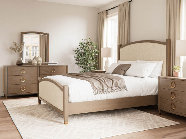 Transform your bedroom into a serene, timeless retreat with the Mebane Bedroom Set, where gently curved solid hardwood frames meet sumptuous performance upholstery and bold modern ring pulls. The centerpiece of the collection, the Mebane Upholstered Bed, showcases clean panel lines, graceful framing, and the natural character of real hardwood. Choose from four standard sizes, each built with rock-solid joinery and a supportive slat system that accepts your preferred mattress and foundation. The spacious dresser, chest of drawers, and oversized nightstand provides generous storage in dovetailed drawers that glide open effortlessly and close softly every time.